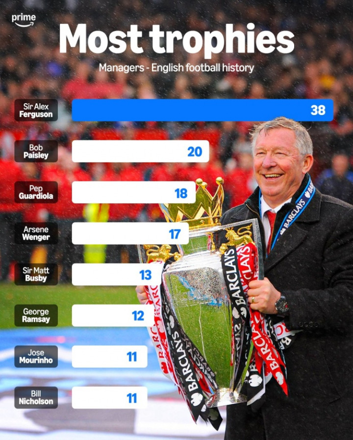 流媒体平台“PrimeVideo”列举出了执教英超球队夺冠数top8的主教练,弗格森爵士38冠遥遥领先,温格、瓜迪奥拉和穆里尼奥在榜。具体如下: